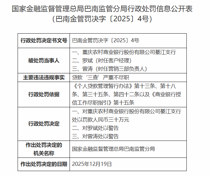 中国经济网北京12月26日电:国家金融监督管理总局25日公布巴南监管分局行政处罚信息公示表(巴南金监局[2025]4号)。重庆农村商业银行股份有限公司綦江支行(以下简称“重庆农商行”,601077.SH)罗斌(时任客户经理)、曾涛(时任营销三部负责人)存在以下违法事实:对贷款“三检”严重忽视。根据《个人贷款管理暂行办法》第十三条、第十八条、第三十五条、第四十二条和《商业银行授信尽职指引》第十五条的规定,国家金融监督管理总局巴南监管分局决定:一、重庆农村商业银行股份有限公司; 2.给予警告罗斌; 3、给予曾涛警告处分。 《个人贷款管理暂行办法》第十三条规定:贷款人必须要求借款人提出书面个人贷款申请,并要求借款人提供能够证明其符合贷款条件的相关资料。 《个人贷款管理暂行办法》第十八条规定:贷款人应当建立并执行贷款约谈制度。贷款人可以根据业务需要通过视频采访借款人(个人住房贷款除外)。视频采访必须在贷款人自己的平台上进行,照片必须是 itala 并妥善保管。贷款人将采取有效措施确定和核实借款人的真实身份以及所涉及信息的真实性。 《个人贷款管理暂行办法》第三十五条规定:贷款人完成委托付款后,必须记录资金流向。跟踪并收集和维护相关凭证。 《个人贷款管理暂行办法》第四十二条规定:借款人未按照合同约定提供真实、完整信息,未按合同约定用途使用和偿还贷款的,贷款人必须依照法律法规和贷款合同的规定,追究违约责任。以下为na原文: