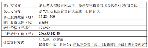 中国经济网北京11月19日讯:梦田家居(603216.sh)今日复牌,股价触及涨停。截至发稿,报17.27元,涨幅10.00%,总市值38.46亿元。昨晚,蒙田家居披露了关于终止发行股票及支付现金购买资产计划,以及控制人实际控制权变更并继续交易的公告。由于蒙田家居已完成发行股份及支付现金购买资产的筹划,且实际玛格苏普勒已完成控制权转让的筹划,公司股票将于2025年11月19日上午复牌。届时,蒙田家居拟取得公司控制权。安海川图微电子有限公司资金。同时,公司收到实际控制人余景源通知,实际控制人正筹划控制权转让,这在前述发行股份及支付现金购买资产中并不需要。公司股票于2025年11月6日(星期四)起停牌。停牌期间,公司就拟发行股份及支付款项购买资产、实际控制人拟变更控制权事宜进行了充分讨论。但由于涉及事项较多,双方就主要条款经过多次讨论和谈判未能达成共识。经过认真考虑和友好协商,各方决定终止上述事项的筹划。梦天家居昨晚还发布了关于签署《股权转让协议》的提示性公告控股股东及其一致行动人的情况及股东权益变动情况。公告称,梦天家居控股股东浙江梦天控股有限公司(以下简称“梦天控股”)及本报告的合并对象嘉兴梦嘉投资管理合伙企业(有限合伙)(以下简称“梦嘉投资”),包括梦天控股控制人余景源、范晓珍和嘉兴汇鑫企业管理合伙企业(有限合伙)(以下简称“梦天”)(以下简称“嘉兴汇鑫”)和受让方与实际控制人曹勇签署了《关于蒙天家居集团股份有限公司的股权转让协议》(以下简称“股权转让协议”),转让方将其持有的无条件出售的上市公司股份共计15,284,500股转让给受让方(占股份总数的6.8636%)。上市公司)。公司收到控股股东梦天控股及其一致行动人梦嘉投资、实际控制人余景源、范晓珍的通知。蒙天控股、蒙嘉投资、余景源、范晓珍于2025年11月17日与嘉兴汇鑫、曹勇签订合同,签订《股份转让协议》,蒙天控股、蒙嘉投资将其持有的上市公司公司15,284,500股无可争议的转让股份转让给嘉兴汇鑫,占上市公司总股本的6.8636%。本协议转让对价为人民币266,855,142.40元。蒙田家居2025年三季报显示,公司实际控制人于景源与范晓珍为夫妻,于景斌、于景源为兄弟。余景源是梦嘉投资执行合伙人。于靖远和范晓珍分别持有Men 90%和10%的股份分别是国嘉投资。余景源、余景斌分别持有梦天控股60%、20%的股份。蒙田家居2021年9月1日披露的招股书显示,蒙田控股另外20%股份由于静媛之女于万静持有。完成本协议项下股份转让登记手续后,各方应严格遵守《上市公司股东减持股份管理暂行办法》等股东减持限制、信息披露、减持等规定。同时,受让方承诺,通过转让协议取得的上市公司股份自转让完成之日起12个月内不会向境外转让。本次权益变动前,蒙田控股及其一致行动人合计持有蒙田控股166,000,000股股份。istedmpanya,占上市公司总股本的74.54%。上市公司控股股东为梦天控股,实际控制人为余靖远、范晓珍。本次权益变动完成后,蒙天控股及一致行动人合计持有上市公司股份150,715,500股,占上市公司总股本的67.68%;受让方将持有上市公司股份15,284,500股,占上市公司总股本的6.8636%。本次权益变动不会导致公司股东控制权和实际控制人发生变化,不涉及要约收购,不会对公司管理架构和未来经营产生重大影响。本协议转让方与受让方之间不存在关联关系,也不存在共同行动关系。股份登记完成后,各方股东遵守《上市公司股东减持股份管理暂行办法》等有关股东减持限制、信息披露、减持额度共享等规定。本次股权变动涉及的股份转让尚需按照上海证券交易所关于过户转让的相关规定确认合规等程序,且股份登记手续已在中国证券登记结算有限责任公司上海分公司办理完毕。本次股权变动能否获得相关部门批准及何时获得批准存在一定的不确定性。 2023年、2024年,蒙田家居业绩将持续下滑。 2022年至2024年,蒙田家居营业收入分别为13.89亿元、13.17亿元、11.68亿元。净收入归属于上市公司股东的净利润分别为2.2亿元、9600万元、6100万元。归属于上市公司股东的扣除非经常性损益的净利润分别为1.86亿元、0.81亿元、0.52亿元。 2025年前三季度,公司营业收入7.73亿元,同比下降2.93%;归属于上市公司股东的净利润5600万元,同比增长37.60%;归属于上市公司股东的扣除非经常性损益的净利润为0.37亿元,同比下降0.02%。
