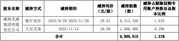 中国经济网北京11月24日电 光威复合材料(300699.SZ)11月21日晚间发布控股减持到期公告。公司于2025年7月31日公告《关于控股股东减持股份的预披露公告》。公司控股股东威海光威集团有限公司(以下简称“光威集团”)拟采用集中竞价、大宗交易的方式。为减持公司股份,自公告之日起十五个交易日后三个月内,减持计划总数不超过10,000,000股,且不超过扣除回购专用账户持有的股份后公司总股本的1.21%。记录随后,公司收到控股股东出具的《关于本次股份购买计划实施进展情况的通知函》。本次减持计划的减持期限已满。 2025年9月29日至2025年11月20日,光威集团通过集中竞价减持8,313,439股。本次减持比例为扣除回购专用账户持股后总股本的1.01%,减持平均价格为28. 61元/股; 2025年11月14日,光威集团通过大宗交易减持1,686,480股。本次减持占扣除专项回购账户持有的股份后总股本的0.20%,折价平均价为26.69元/股。 2025年9月29日至2025年11月20日,光威集团累计减持9,999,919股。计算后,光威减少的值i集团持股2.83亿元。 2022年至2024年,公司营业收入分别为25.11亿元、25.18亿元、24.50亿元,归属于上市公司股东的净利润分别为9.34亿元、8.73亿元、7.41亿元。归属于上市公司股东的扣除非经常性损益的净利润分别为8.74亿元、7.12亿元、6.68亿元,经营活动产生的现金流量净额分别为1.47亿元、5.34亿元、8.63亿元。 2025年前三季度,公司实现营业收入19.86亿元,同比增长4.40%;归属于上市公司股东的净利润4.15亿元,同比下降32.55%;归属于上市公司股东的扣除非经常性收益的净利润净利润及亏损3.76亿元,同比下降32.22%;经营活动产生的现金流量净额2.88亿元,同比增长179.27%。