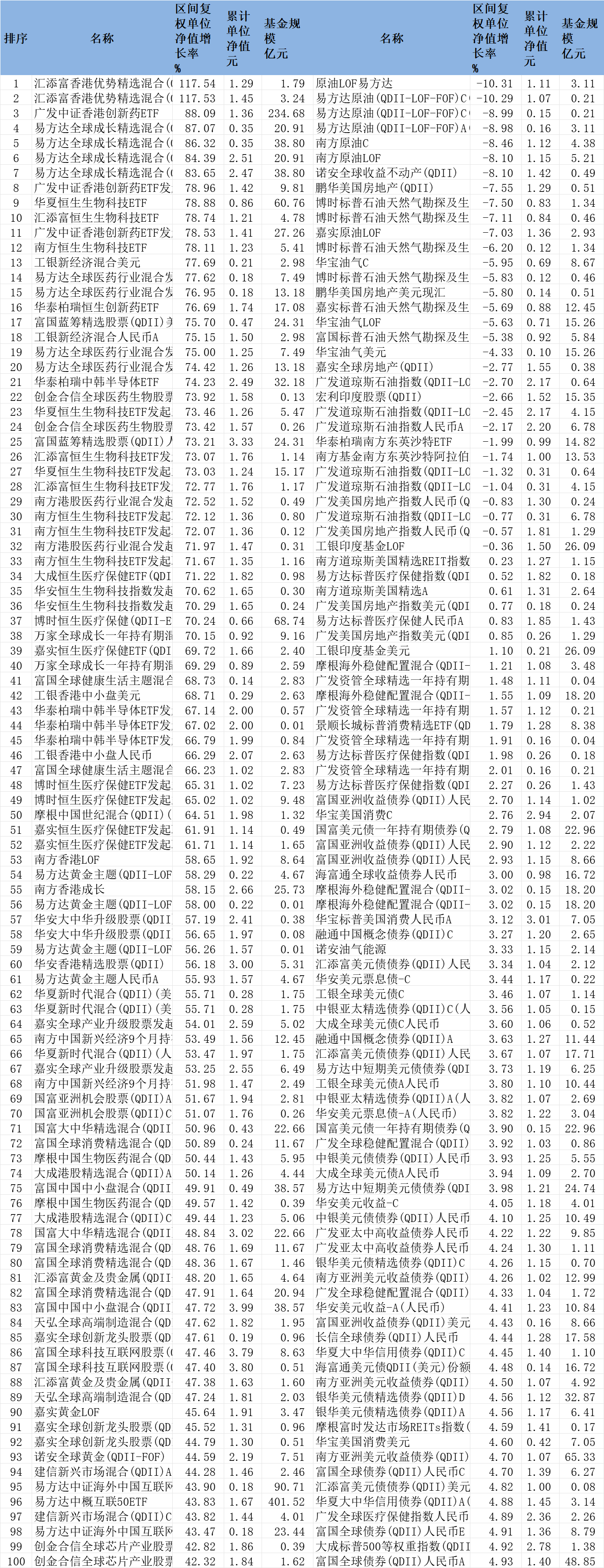 中国经济网北京11月10日电(记者何晓)今年前10个月,市场上业绩可比的650只QDII基金(各类股票单独计算,下同)中,共有618只基金净值上涨,占比95.1%; 32只基金净值减少。年初以来,精选创新医药板块,相关个股普遍上涨,重仓该类股票的基金也取得了不错的回报。同花顺数据显示,今年前10个月,汇添富香港优势精选Mix C和汇添富香港优势精选Mix A LED QDIi基金的收益率分别为117.54%和117.53%。三季报显示,汇添富香港Advantage Select Hybrid A/C遵循以下方向的投资和布局主线: 1)创新药:产品具有全球竞争力和增长空间的制药和生物技术; 2)顶级设备及耗材,进口替代率低,壁垒高。三季度末,汇添富香港精选混合A/C前十大持股分别为银正生物、科伦坡泰生、信达生物、三生制药、康诺雅、石药集团、恒瑞制药、诺诚健华、荣昌生物、复宏汉霖。该基金现任基金经理为张伟。张伟曾任东方证券医药研究员助理、汇添富基金医药研究员、医药行业高级医药研究员、课题组组长。同时,10只QDII基金前三季度涨幅超过78%,其中4只产品为E(美元现货份额)、易方达全球Growth Select Mix (QDII) C(美元现货份额)、易方达全球成长精选(QDII)(人民币份额)均上涨超过83%。三季度末,上述四只基金持股前十名分别为台积电、英伟达、谷歌、博通、天弘科技、阿里巴巴、美光科技、欣旺达、巨辰科技、澜起科技。这四只基金目前由基金经理郑曦管理,郑曦现任易方达基金管理有限公司股权投资管理部副总经理、基金经理。另外六只前三季度涨幅超过78%的QDII基金为广发中证香港创新药ETF、广发中证香港创新药ETF发起链接(QDi)A、华夏恒盛生物科技ETF、汇添富恒盛生物科技ETF。广发中证香港创新药ETF发起链接(QDII)C.南方恒生生物科技ETF,涨幅分别为88.09%、78.96%、78.88%、78.74%、78.53%、78.11%。在这些资金的增加得益于创新医药板块的出色表现。以规模较大的中国恒盛生物科技ETF为例。三季度末,基金规模60.76亿元。持股前十名分别为药明生物、百济神州、信达生物、康方生物、中国生物制药、石药集团、三生制药、药明康德、豪森药业、京东健康。目前由基金经理赵宗廷管理。赵宗廷曾任嘉实基金管理有限公司指数投资部助理基金经理,嘉实国际资产管理有限公司基金经理于2016年11月加入华夏基金管理有限公司。在跌幅榜单中,前十个月底部的QDIi基金主要是原油、石油和房地产产品。此外,一些追踪标普500医疗保健等加权指数的QDII基金也没有变化。数据源为2025年前10个月QDII基金前100名:同花顺(规模截止日期:2025年9月30日)